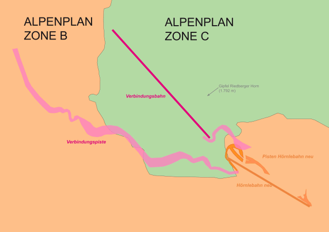 Zur Erreichung dieses Ziels ist der bayerische Alpenraum in die drei Zonen A, B und C unterteilt. Je nach Art sind unterschiedliche Infrastrukturmaßnahmen erlaubt oder untersagt. In der Zone A, die 35 Prozent der Fläche umfasst, ist die Errichtung weiterer Erschließungsanlagen grundsätzlich möglich. Entsprechende Vorhaben werden jedoch auf ihre Raum- und Umweltverträglichkeit überprüft. In der Zone B, die 23 Prozent des bayerischen Alpenraums betrifft, sind Verkehrserschließungen nur unter Berücksichtigung eines strengen Maßstabes möglich. Die viel diskutierte Zone C, die nun für die Skischaukel am Riedberger Horn außer Kraft gesetzt werden soll, umfasst rund 43 Prozent der Alpenfläche. Technische Erschließungen sind hier laut Alpenplan strengstens untersagt.