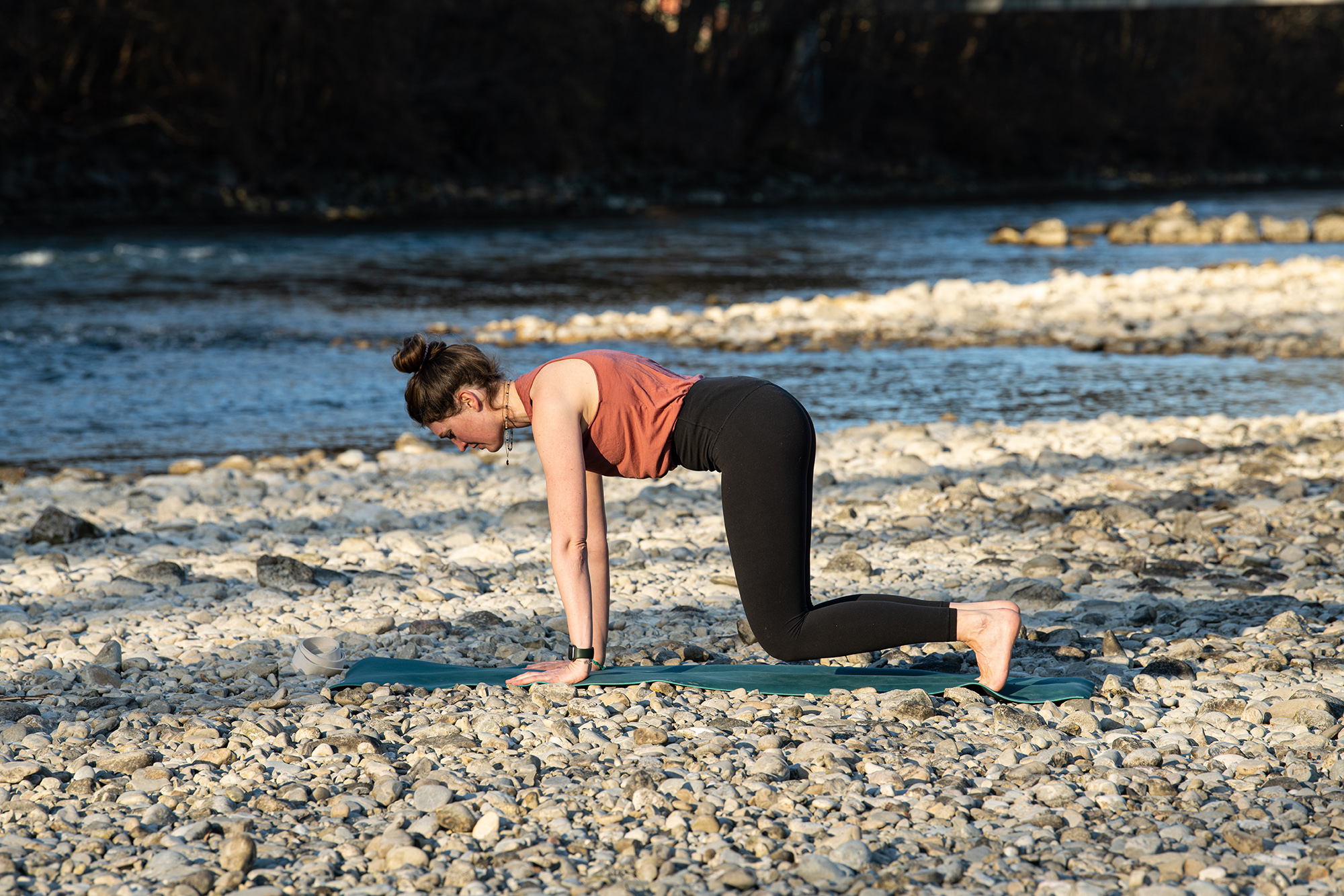 Der Vierfüßlerstand mit angehobenen Knien ist ein echtes Multitalent: Er aktiviert unsere Schultern, Füße, Oberschenkelmuskulatur und ganz wichtig unseren Core und stärkt unser Durchhaltevermögen. Denn er sieht zwar entspannt aus, verlangt aber einiges an Willenskraft.